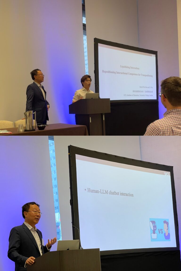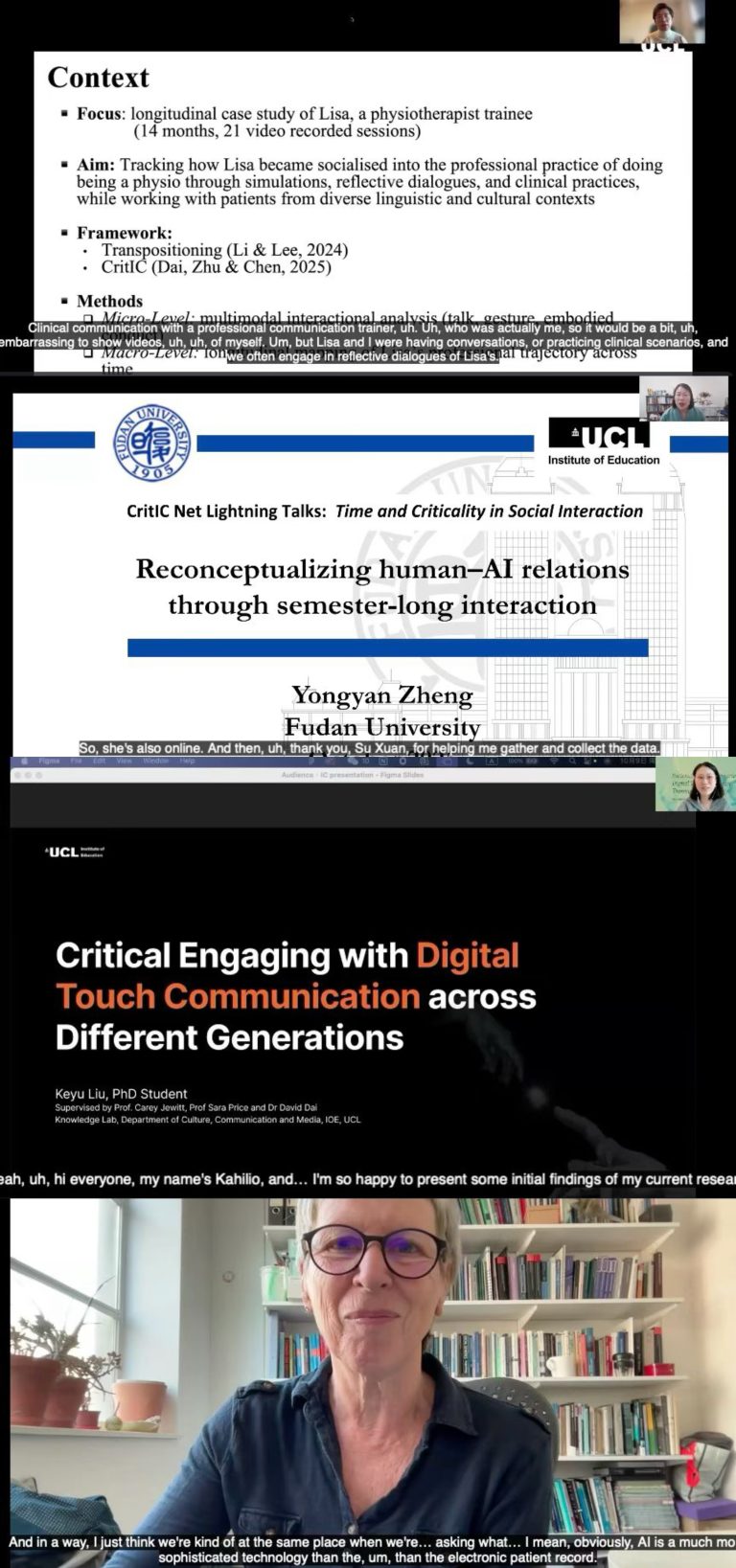 Dr. Simin Ren, Prof. Li Wei, and I presented our recent paper examining how a physiotherapist develops professional interactional competence over a 14-month period. Prof. Yongyan Zheng from Fudan University discussed her exciting new project on human–AI relations through semester-long interactions. Keyu Liu, a PhD student at UCL co-supervised by Prof. Carey Jewitt, Prof. Sara Price, and myself, showcased her innovative research on critical engagement with digital touch communication across generations.